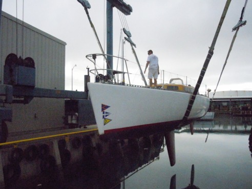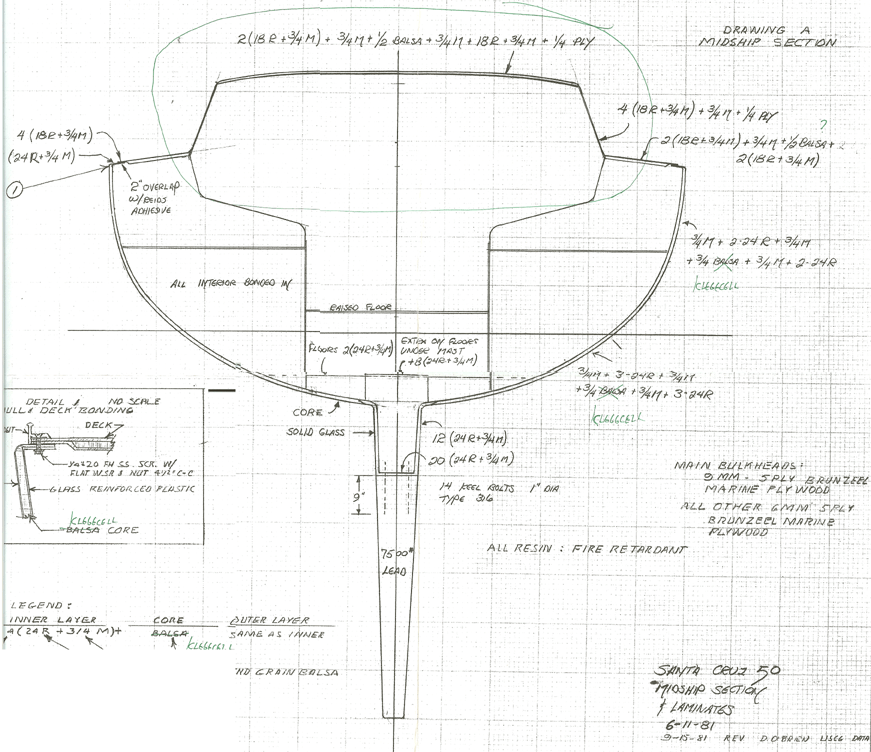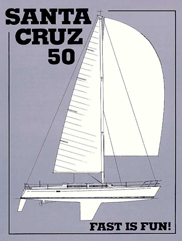 Commissioned by Randy Parker, of Santa Cruz, Chasch Mer is THE first of this ULDB design. As the first she is a prototype and purported to be a little lighter and fairer. She is the only SC50 with foam core (all others are balsa wood core). Her cabin is 4' shorter than the others which gives her a 2' longer foredeck and 2' longer cockpit. She originally had no opening cabin-top hatch, no private head, 3 windows at the forward end of the cabin (not one), 4 windows on each cabin side (not 2), there is no forepeak double bunk, there are 2 pipe berths under the settees and 3 water tanks under the the raised main cabin floor. |